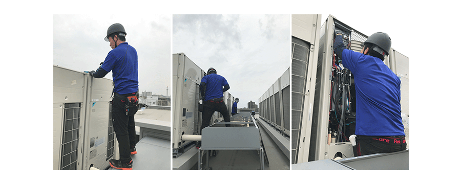 工事は日中営業されたままで工事を行いますので、問題ありません。基本的に、室外機が置かれている屋上やバックヤードなどでの作業となりますので、お客様やスタッフ様にご迷惑をおかけすることなく工事ができます。ご安心ください。