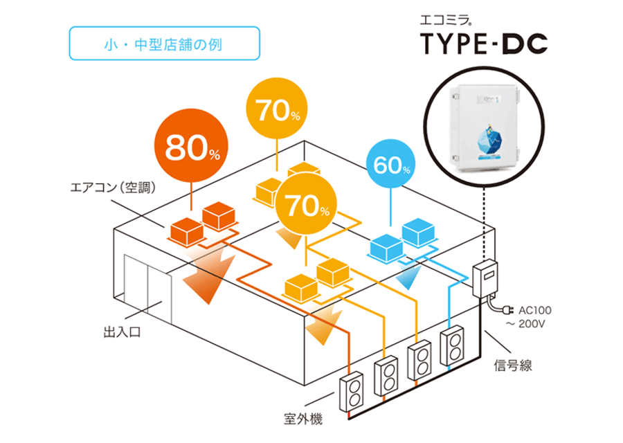 DCエコミラDCは、自動制御で空調機のインバーターモーターの回転数を下げることにより、エアコンを止めることなく消費電力が抑えられ、電気代を削減する省エネ効果の高いコントロールシステムです。新設の空調設備だけでなく、後付けが可能ですので、お使いの空調設備を入れ替えることは不要です。ありそうでなかった技術、それがエコミラDCです。
