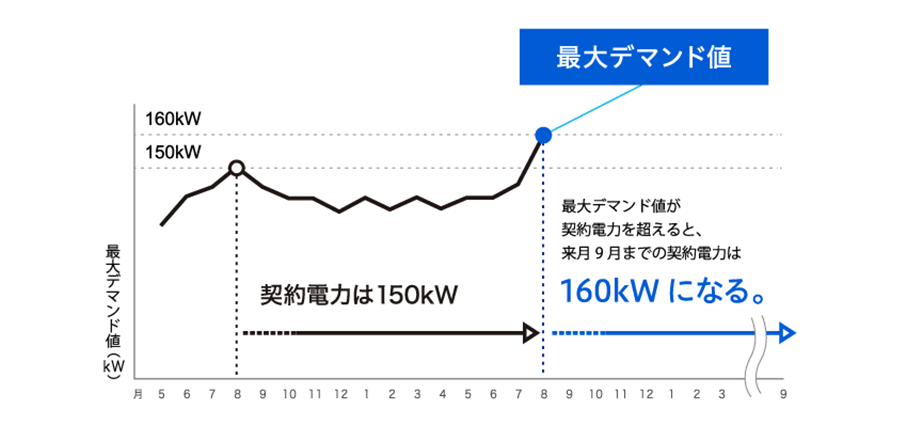 高圧電力のメーターは30分毎の電力の平均値を計算しています。これをデマンド値といい、1ヶ月の中で一番大きいデマンド値を最大デマンド値といいます。そして1年間においての最大デマンド値が次の1年間の契約電力となります。その契約電力を下げるのがエコミラの大きな役目です。