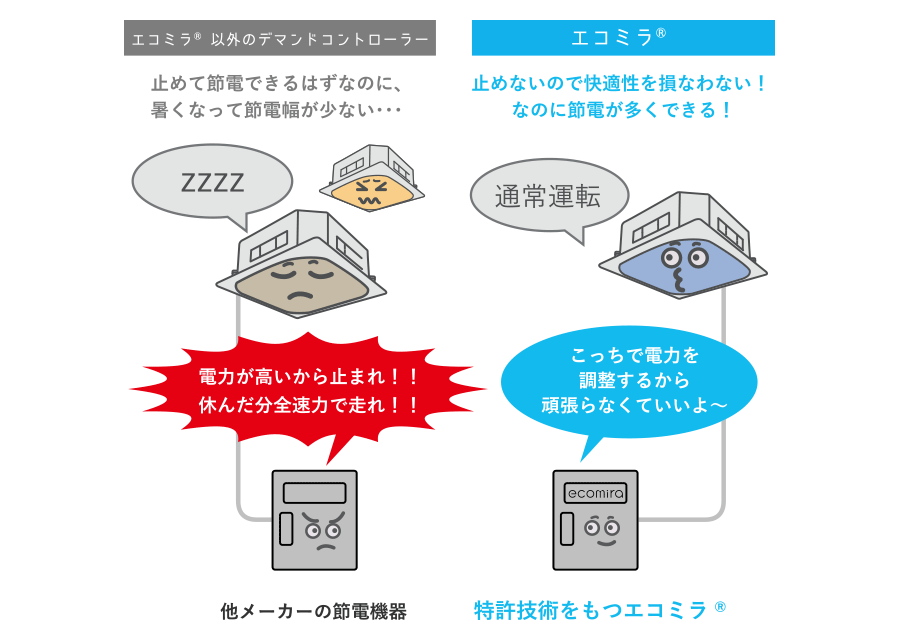 他社様のデマンドコントローラーのほとんどが室外機を順番に止めて「送風」運転に切り替える方式です。その「送風」を止めないと言っているデマンドコントローラーが多いですが、熱交換を行っていないので実質止まっていることになります。エコミラDCは熱交換を常時止めずに省エネできる方法を特許取得しているので、止めない省エネはエコミラDCだけです。